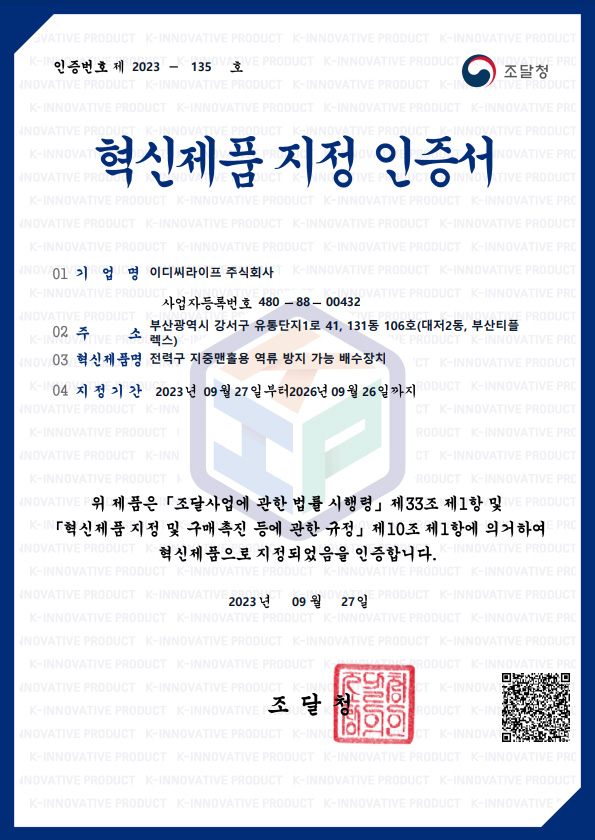 UNDER DRAIN은 EDC LIFE의 기술로 획득한 특허를 기반으로 개발되었으며, 조달청 혁신제품 지정, 산업통상자원부의 신제품(NEP) 획득, SOC공공기관 협의체의 SOC기술마켓 인증을 수여받아 그 기술력을 인정받고 있습니다.
